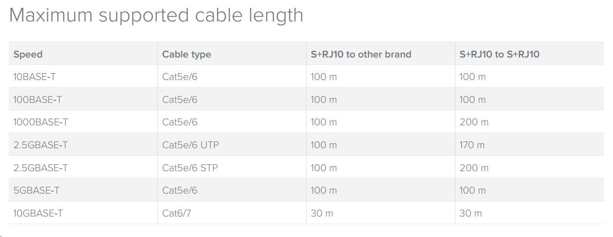 S+RJ10 je jedinečný modul SFP+, ktorý dokáže komunikovať rýchlosťou 10 Mb/s až 10 Gb/s cez ethernetový kábel. Zaujímavou funkciou je možnosť pripojenia 1 Gb/s až na vzdialenosť 200 m pri inštalácii medzi 2 identickými modulmi S+RJ10.