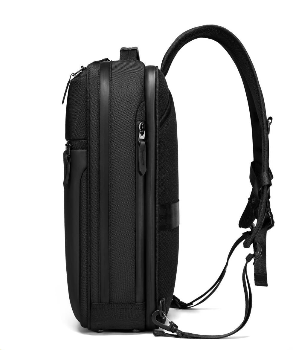 MYBALO ASTON Perfektní volba pro minimalisty s dobrým vkusem 6 ikon: - Nejtenčí batoh - Elegantní - Kapsa na notebook do 15,6" - Kapsa na tablet do 9" - Otevírání o 180 stupňů - USB a USB-C port - Drží tvar - Voděodolný - Skryté kapsy Elegantní a minimalistický Jedná se o velmi elegantní a minimalistický batoh. S tímto parťákem neuděláte chybu při běžném nošení do města, ani na důležité schůzce. Tenký batoh MYBALO Aston je batoh s vůbec nejmenší hloubkou z naší nabídky. Díky tomu působí elegantně a minimalisticky, ale i přesto se do něj vejdou všechny vaše nezbytnosti. Kvalitní voděodolný materiál, dlouhá životnost Kvalitní umělá kůže zajišťuje trvanlivost a odolnost batohu proti vodě a opotřebení. MYBALO Aston tak bude vaším společníkem opravdu dlouho. Drží tvar Batoh si zachovává svůj tvar také v případě, že jej budete mít úplně prázdný. Vestavěný USB a USB-C port Nabíjejte svá elektronická zařízení kdekoli a kdykoli díky vestavěnému USB a USB-C portu. Popruh k uchycení na kufr Cestujte pohodlně. Kdykoli chcete mít volná záda, jednoduše připevněte batoh na rukojeť svého kufru. Pohodlné polstrování Užijte si komfortní nošení díky kvalitnímu a prodyšnému polstrování ramenních popruhů a zádové části. Další praktické kapsy Zorganizujte si pohodlně a snadno své věci díky množství vychytaných kapes. Skryté kapsy V zádové části a na ramenním popruhu najdete skryté kapsy pro bezpečné uložení cenností. Vnitřní kapsy Vnitřní kapsy slouží pro snadnou organizaci všech vašich věcí. Přední kapsa Přední kapsa je určena pro věci, které chcete mít rychle a snadno po ruce. Parametry: - Rozměry: 46 x 30 x 9 cm - Objem: 11 l - Hmotnost: 1,19 kg - Kapsa na notebook: Ano (do vel. 15,6") - Kapsa na tablet: Ano (do vel. 9") - USB port: Ano - Voděodolnost: Ano - Hlavní materiál: Ekokůže + Polyester - Podšívka: Polyester - Barva: Černá.
