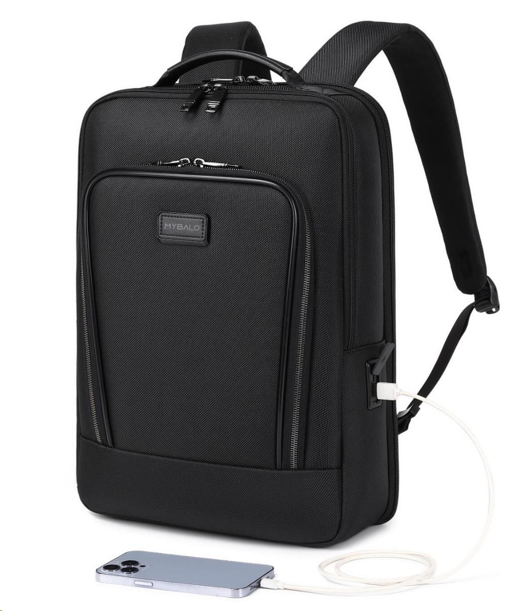 MYBALO ASTON Perfektní volba pro minimalisty s dobrým vkusem  6 ikon: - Nejtenčí batoh - Elegantní - Kapsa na notebook do 15,6" - Kapsa na tablet do 9" - Otevírání o 180 stupňů - USB a USB-C port - Drží tvar - Voděodolný - Skryté kapsy  Elegantní a minimalistický Jedná se o velmi elegantní a minimalistický batoh. S tímto parťákem neuděláte chybu při běžném nošení do města, ani na důležité schůzce.  Tenký batoh MYBALO Aston je batoh s vůbec nejmenší hloubkou z naší nabídky. Díky tomu působí elegantně a minimalisticky, ale i přesto se do něj vejdou všechny vaše nezbytnosti.  Kvalitní voděodolný materiál, dlouhá životnost Kvalitní umělá kůže zajišťuje trvanlivost a odolnost batohu proti vodě a opotřebení. MYBALO Aston tak bude vaším společníkem opravdu dlouho.  Drží tvar Batoh si zachovává svůj tvar také v případě, že jej budete mít úplně prázdný.  Vestavěný USB a USB-C port Nabíjejte svá elektronická zařízení kdekoli a kdykoli díky vestavěnému USB a USB-C portu.  Popruh k uchycení na kufr Cestujte pohodlně. Kdykoli chcete mít volná záda, jednoduše připevněte batoh na rukojeť svého kufru.  Pohodlné polstrování Užijte si komfortní nošení díky kvalitnímu a prodyšnému polstrování ramenních popruhů a zádové části.  Další praktické kapsy Zorganizujte si pohodlně a snadno své věci díky množství vychytaných kapes.  Skryté kapsy V zádové části a na ramenním popruhu najdete skryté kapsy pro bezpečné uložení cenností.  Vnitřní kapsy Vnitřní kapsy slouží pro snadnou organizaci všech vašich věcí.  Přední kapsa Přední kapsa je určena pro věci, které chcete mít rychle a snadno po ruce.  Parametry: - Rozměry: 46 x 30 x 9 cm - Objem: 11 l - Hmotnost: 1,19 kg - Kapsa na notebook: Ano (do vel. 15,6") - Kapsa na tablet: Ano (do vel. 9") - USB port: Ano - Voděodolnost: Ano - Hlavní materiál: Ekokůže + Polyester - Podšívka: Polyester - Barva: Černá