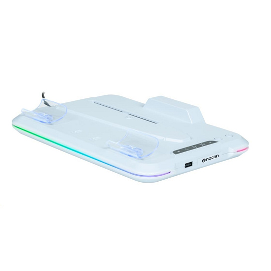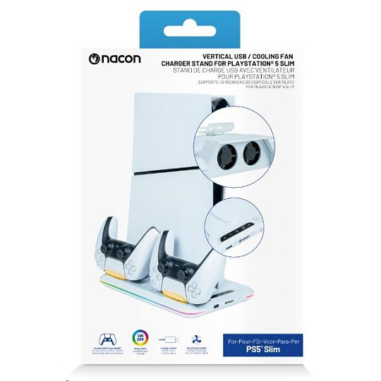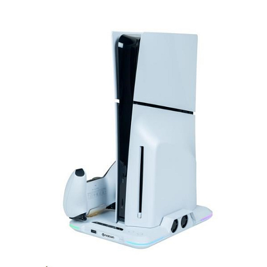Umiestnite svoju hernú konzolu PlayStation 5 Slim na tento viacúčelový vertikálny základňa od spoločnosti Nacon. Ten je kompatibilný s diskovou aj digitálnou verziou tejto konzoly a okrem dvoch ventilátorov a jedného portu USB-A na nej nájdete aj dve kolísky slúžiace na nabíjanie herných ovládačov DualSense, pričom o stave ich nabíjania vás informuje farebné podsvietenie pod jednotlivými ovládačmi.