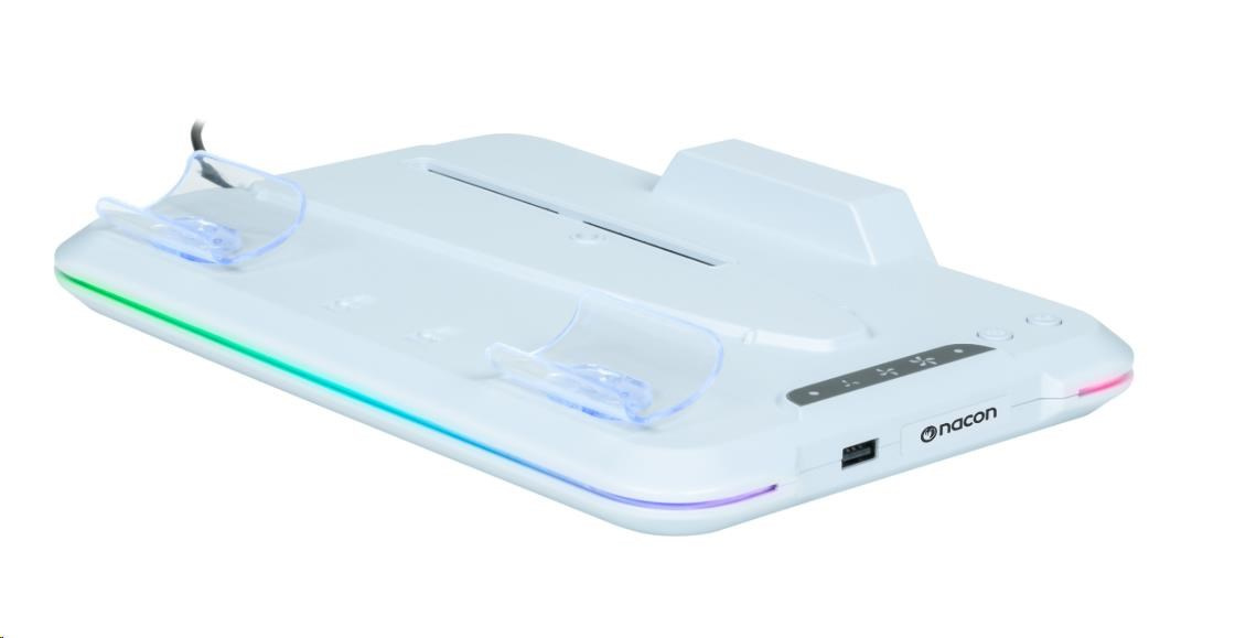 Umiestnite svoju hernú konzolu PlayStation 5 Slim na tento viacúčelový vertikálny základňa od spoločnosti Nacon. Ten je kompatibilný s diskovou aj digitálnou verziou tejto konzoly a okrem dvoch ventilátorov a jedného portu USB-A na nej nájdete aj dve kolísky slúžiace na nabíjanie herných ovládačov DualSense, pričom o stave ich nabíjania vás informuje farebné podsvietenie pod jednotlivými ovládačmi.