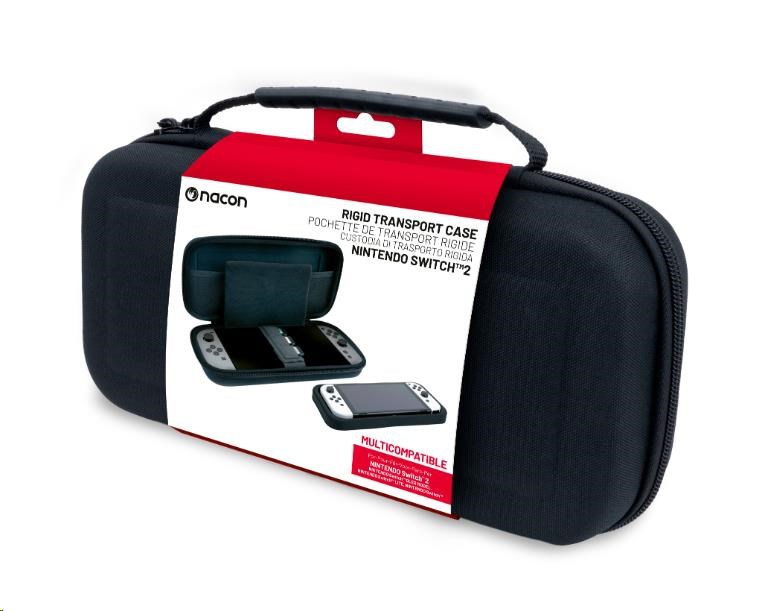 V tomto pevném prepravnom puzdre od spoločnosti Nacon môžete bezpečne a bez obáv prepravovať svoju hernú konzolu Nintendo Switch 2. Polstrovaný oddelovač uprostred puzdra sa postará o to, aby obrazovka konzoly neutrpela pri preprave ani škrabnutie, a na pásku na suchý zips držiacom konzolu na mieste nájdete navyše tri kapsičky na uloženie kariet s vašimi obľúbenými hrami. V sieťovanej kapsičke v hornej časti puzdra sa potom nachádza dostatok priestoru pre nevyhnutné príslušenstvo. Súčasťou puzdra je tiež vyberateľné medzidno pre konzolu Switch, Switch Lite a Switch – OLED Model.