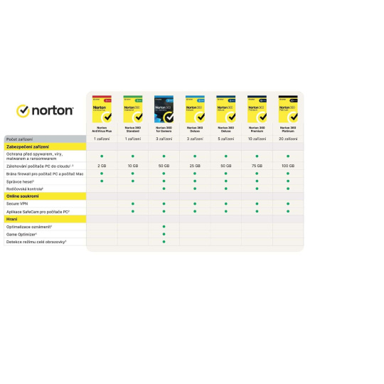 Elektronická licencia Norton 360 Deluxe poskytuje komplexnú ochranu proti škodlivému softvéru až pre 3 počítače PC, Mac, zariadenia so systémom Android alebo iOS, ako aj rodičovskú kontrolu, ktorá pomáha chrániť vaše deti online, správcu hesiel na ukladanie a správu hesiel a funkciu zálohovania z PC do cloudu. Norton 360 Deluxe obsahuje aj sieť VPN pre 3 zariadenia a aplikáciu na ochranu fotoaparátu pre počítače. Určené pre nových používateľov a na obnovenie licencií existujúcich používateľov