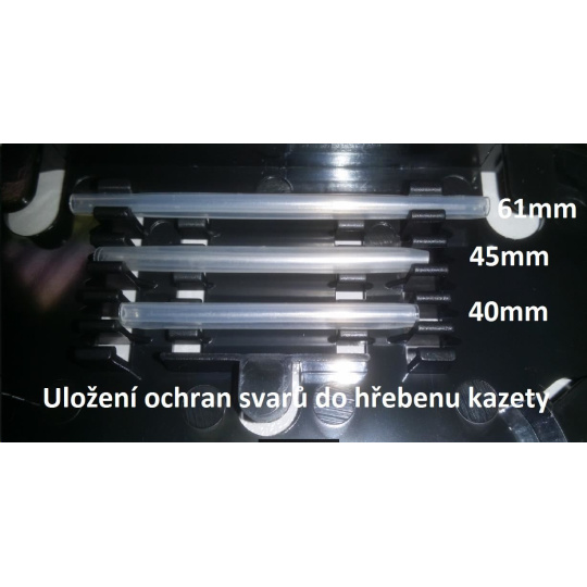 Samostmievacia zmršťovacia zmršťovacia fólia s dĺžkou 61 mm, určená na ochranu zvaru po zváraní. Vystužené oceľovým drôtom 0,75mm, ktorý zabraňuje ohýbaniu. Vnútorný priemer pred utesnením 1,2 mm. Okružná. Vonkajší rozmer po utesnení 2,0 mm. Teplota utesnenia musí byť najmenej 110 °C.