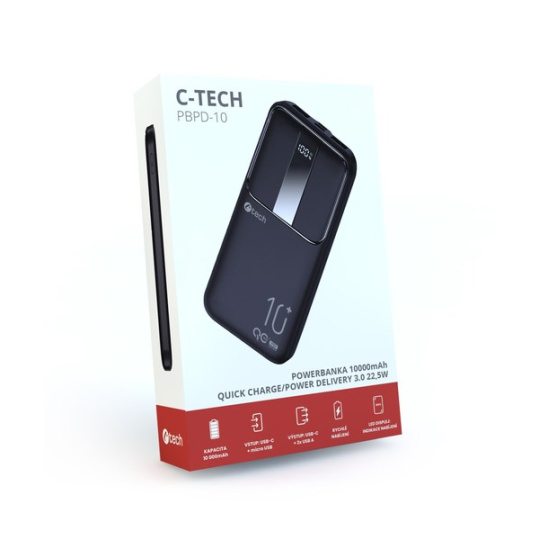 C-TECH Powerbanka 10000mAh, Li-Pol, 22,5W, USB-C/USB-A/micro USB