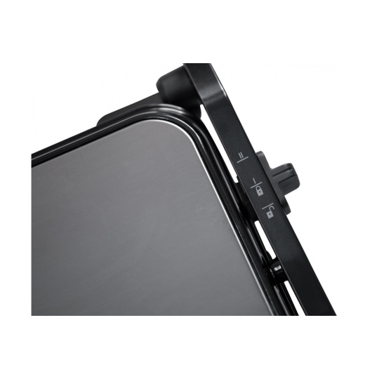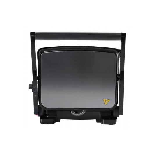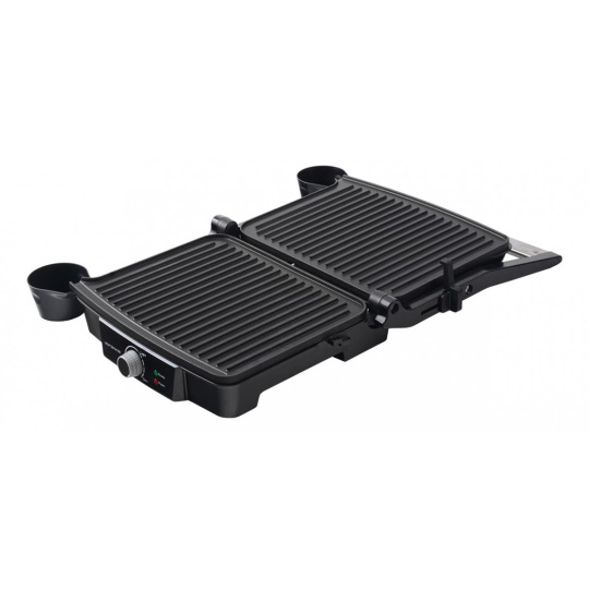 "Elektrický stolní kontaktní gril, Plynulá regulace teploty termostatem, Grilovací desky s nepřilnavou vrstvou, Světelné kontrolky provozu, Tepelně izolovaná rukojeť, Odkapávací misky na šťávu, snadné čištění, Napájení: 230V ~ 50Hz, 2 000 W, rozměry: 35x11,5x33.