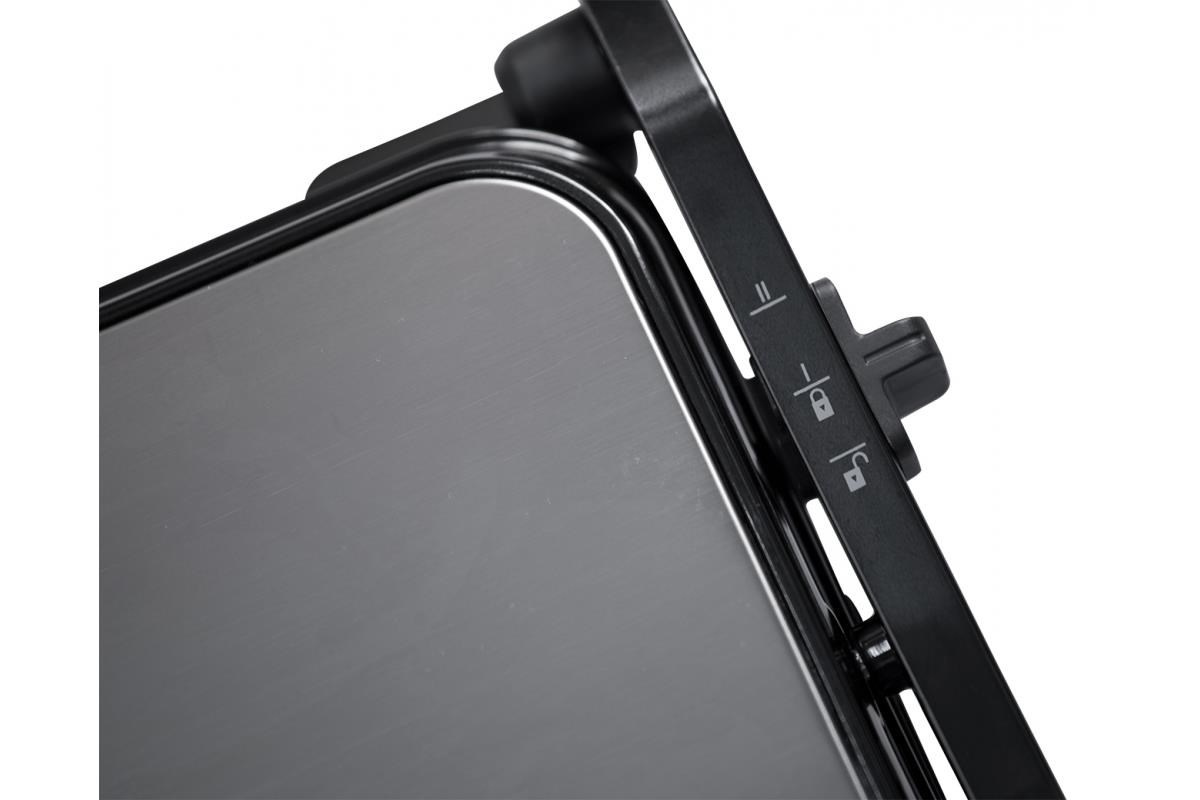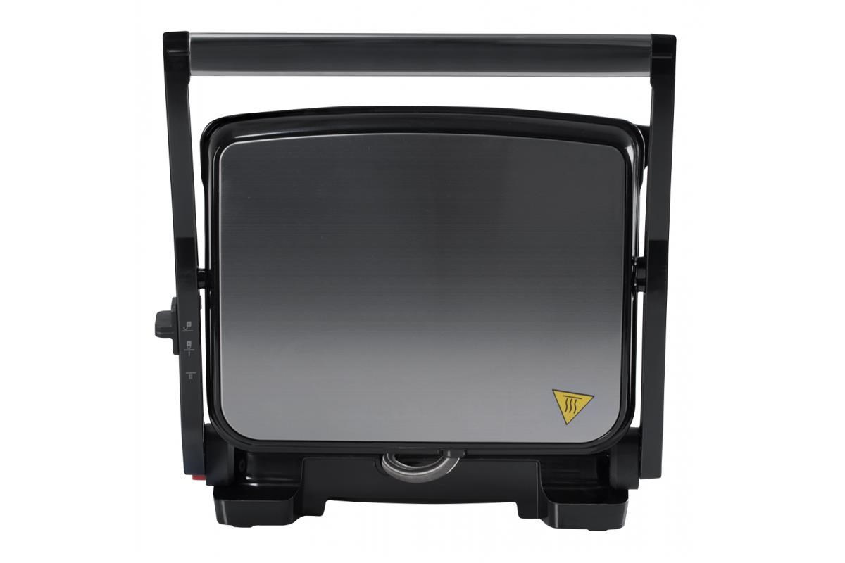 "Elektrický stolní kontaktní gril, Plynulá regulace teploty termostatem, Grilovací desky s nepřilnavou vrstvou, Světelné kontrolky provozu, Tepelně izolovaná rukojeť, Odkapávací misky na šťávu, snadné čištění, Napájení: 230V ~ 50Hz, 2 000 W, rozměry: 35x11,5x33.