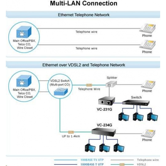 PLANET VC-231G Ethernet cez telefónnu linku (technológia VDSL2). 1x LAN RJ-45, 1x VDSL2 RJ-11. Priehľadný most. G.993.2 VDSL2, G.993.5 G.Vektorovanie + G.INP. Kapacita 200/160 Mb/s na 200 m. Dosah až 1,4 km. Nastavenie prepínača DIP, voliteľne Master (CO) / Slave (CPE). Možná prevádzka na linke VDSL O2. Ethernetový konvertor LRE (Long Reach Ethernet) na VDSL2 (Very-high-data-rate Digital Subscriber Line 2) umožňuje prenášať dáta po symetrickom páre vodičov rýchlosťou až 200 Mbit/s na vzdialenosť 200 m alebo 30 Mbit/s na vzdialenosť až 1,4 km, pričom prenosové rýchlosti závisia od stavu a kvality použitej linky. Zariadenie je univerzálne ako jednotka master (CO) / slave (CPE), režim sa nastavuje prepínačom. Jednotka podporuje prevádzkové režimy VDSL2 podľa prenosových profilov "17a" a "30a", "pásmo Plan997" a G.993.5 G.Vektorovanie a G.INP ovplyvňuje symetrický prenos dát pri vyšších rýchlostiach aj na paralelných linkách. Pomocou externého rozdeľovača je možné zachovať hlasovú službu na telefónnej linke bez ďalších úprav kabeláže. Takto je možné využívať telefónne káblové vedenia pôvodne určené na pripojenie nielen k účastníkom, ale aj medzi analógovými ústredňami. Poskytovatelia internetových služieb (ISP) môžu ponúkať multimediálne služby, VOD (video na požiadanie), VoIP (voice over IP), videotelefón, IPTV atď. Aplikácia VDSL2 s pokročilým G.INP a G.Vektorovanie možno prevádzkovať aj v rámci aktívnych prvkov prostredníctvom rozhraní SFP vďaka modulu XL-MGB-VDSL2-R2 (pozri. odporúčané príslušenstvo). Modem možno úspešne prevádzkovať cez linky VDSL spoločnosti O2. ZÁKLADNÉ ŠPECIFIKÁCIE Porty: 1 x 10/1000Base-T, RJ-45 1 x VDSL, RJ-11 Podpora prenosu: JumboFrame 2K MAC adries IEEE 802.3, IEEE 802.3u, IEEE 802.3ab, IEEE 802.3x, IEEE 802.3p Transparent pre IEEE 802.1Q VLAN tag Štandard: ITU-T: G.993.1 - VDSL, G.997.1, G.993.2 - VDSL2 (profily 17a/30a), G.993.5 G. - Vektorovanie a G.INP, G.998 Prepínanie DIP: výber CPE/CO, výber modulácie, výber komunikačného limitu, výber SNR Napájanie: z externého adaptéra, 5V/2A Prevádzková teplota: 0 až 50 °C, vlhkosť <90 % Rozmery: 97 x 70 x 26 mm Hmotnosť: 184 g Možno inštalovať do šasi MC-700, MC-1500, MC-1500R Príklad rozsahov a rýchlostí (down/up Mb/s) na linkách s vodičmi AWG24 a lepšími: 200 m -> 225.34Mb/122.39Mb 400m -> 151.89Mb/78.78Mb 600m -> 90.42Mb/49.93Mb 800m -> 57.70Mb/29.87Mb 1000m -> 45.33Mb/9.21Mb 1400m -> 34.74Mb/5.75Mb Nastavenie modemu pre pripojenie O2 VDSL v režime CPE; ďalšie prepínače DIP Prenos, Pásmo, SNR podľa kvality spojenia v routeri na rozhraní WAN použite VLAN ID:848 cez WAN nastavte PPPoE klienta, Prihlásenie: O2/O2 venujte pozornosť aj nastaveniam vášho routera, jeho firewallu, prístupovým právam, UPnP atď...
