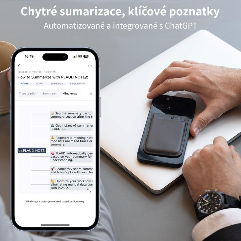Plaud Note je AI hlasový záznamník, ktorý vám s pomocou ChatGPT nástrojov podstatne uľahčí život. Záznamník má minimalistický dizajn ocenený cenou Red Dot za výnimočný dizajn a minimalistické sú aj jeho rozmery – je veľký ako platobná karta. Záznamník podporuje 57 jazykov vrátane češtiny a slovenčiny. Plaud Note ponúka duálny režim nahrávania, a to pre diktovanie poznámok a druhý pre nahrávanie hovorov. Vďaka vstavanému 64GB úložisku môžete na Plaud Note nahrať až 480 hodín záznamu a jeho energetická nenáročnosť zabezpečí 30 hodín kontinuálneho záznamu a 60 dní pohotovostného režimu. Absolútne výnimočné je u osobných záznamníkov prepojenie Plaud Note s ChatGPT. Vďaka aplikácii Plaud môžete nechať nadiktované záznamy prepísať, vytvoriť z nich zhrnutia, a dokonca nechať AI vytvoriť, dnes veľmi populárne, myšlienkové mapy. V cene produktu je navyše zahrnuté cloudové úložisko pre 10.000 minút záznamu. Služba PLAUD AI Membership má dve varianty. Starter a Pro. Starter ponúka takmer všetky funkcie, obsahuje 300 minút transkripcie záznamu a je zdarma. Verzia Pro poskytuje 1200 minút prepisu, rozšírený výber šablón, a navyše prioritu pri prístupe k pripravovaným funkciám, ako je napríklad rozpoznanie osoby alebo prekladač. Aktuálna cena služby Pro je 249 Kč mesačne* pri mesačnom platbe, alebo 1990 Kč ročne*. Ďalšie neplatené funkcie, ktoré robia spoluprácu s Plaud Note jedinečnou, je AI processing, zabezpečujúci elimináciu ruchu na pozadí. Funkciu je možné aktivovať aj dodatočne, po vytvorení záznamu, a dá sa nastaviť v troch intenzitách pre každú príležitosť. Poznámky tak môžete v pokoji diktovať aj na rušnej ulici a výsledkom bude len váš, izolovaný hlas. Záznamník sa ovláda fyzickým tlačidlom s haptickou odozvou a fyzickým prepínačom režimov. Záznam začína aj končí jediným stlačením tlačidla, tak jednoduché to je. (*cena predplatného aktuálna k 20.5.2024)