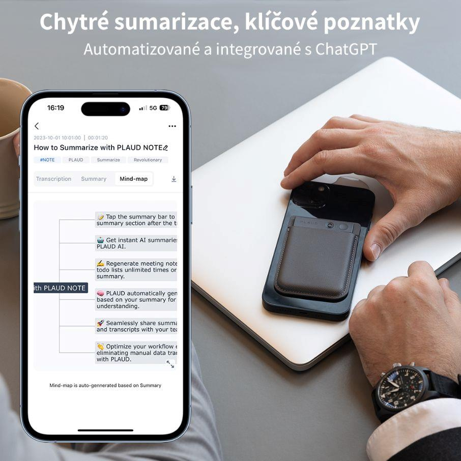 Plaud Note je AI hlasový záznamník, ktorý vám s pomocou ChatGPT nástrojov podstatne uľahčí život. Záznamník má minimalistický dizajn ocenený cenou Red Dot za výnimočný dizajn a minimalistické sú aj jeho rozmery – je veľký ako platobná karta. Záznamník podporuje 57 jazykov vrátane češtiny a slovenčiny. Plaud Note ponúka duálny režim nahrávania, a to pre diktovanie poznámok a druhý pre nahrávanie hovorov. Vďaka vstavanému 64GB úložisku môžete na Plaud Note nahrať až 480 hodínzáznamu a jeho energetická nenáročnosť zabezpečí 30 hodín kontinuálneho záznamu a 60 dní pohotovostného režimu. Absolútne výnimočné je u osobných záznamníkov prepojenie Plaud Note s ChatGPT. Vďaka aplikácii Plaud pak môžete nechať nadiktované záznamy prepísať, tvoriť z nich súhrny, a dokonca nechať AI vytvoriť, dnes veľmi populárne, myšlienkové mapy. V cene produktu je navyše zahrnuté cloudové úložisko pre 10.000 minút záznamu. Služba PLAUD AI Membership má dve varianty. Starter a Pro. Starter ponúka takmer všetky funkcie, obsahuje 300 minút transkripcie záznamu a je zadarmo. Verzia pro ponúka 1200 minút prepisu, rozšírený výber šablón, a navyše prioritný prístup k chystaným funkciám ako je napríklad rozpoznanie osoby alebo prekladač. Aktuálna cena služby pro je 249 Kč mesačne* pri mesačnom účtovaní, alebo 1990 Kč ročne*. Ďalšia z bezplatných funkcií, ktoré robia spoluprácu s Plaud Note je AI processing, zabezpečujúci elimináciu ruchu na pozadí. Túto funkciu je možné aktivovať aj dodatočne, po vytvorení záznamu a dajú sa ju nastaviť v troch intenzitách pre každú príležitosť. Poznámky tak môžete v pokoji diktovať aj na rušnej ulici a výsledkom bude len váš, izolovaný hlas. Záznamník sa ovláda fyzickým tlačidlom s haptickou odozvou a fyzickým prepínačom režimov. Záznam začína aj končí jediným stlačením tlačidla, tak jednoduché to je. (*cena predplatného aktuálna 20.5.2024)