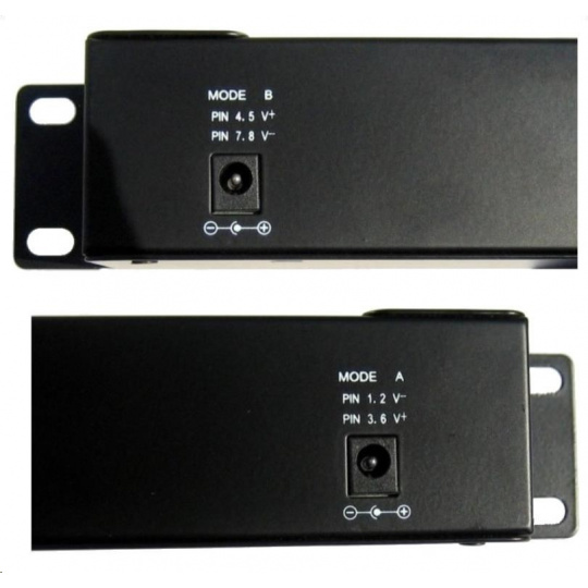 Vstup pre napájanie cez dva 2,1 mm 60V jacky, všetkých 12 portov je napájaných vždy z oboch vstupov súčasne v režime podľa zvoleného A/B vstupu: