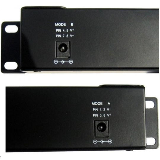 Vstup pre napájanie cez dva 2,1 mm 60V jacky, všetkých 12 portov je napájaných vždy z oboch vstupov súčasne v režime podľa zvoleného A/B vstupu: