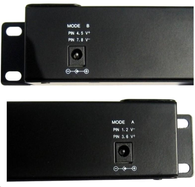 Vstup pre napájanie cez dva 2,1 mm 60V jacky, všetkých 12 portov je napájaných vždy z oboch vstupov súčasne v režime podľa zvoleného A/B vstupu:
