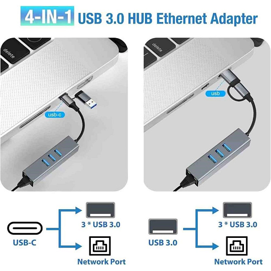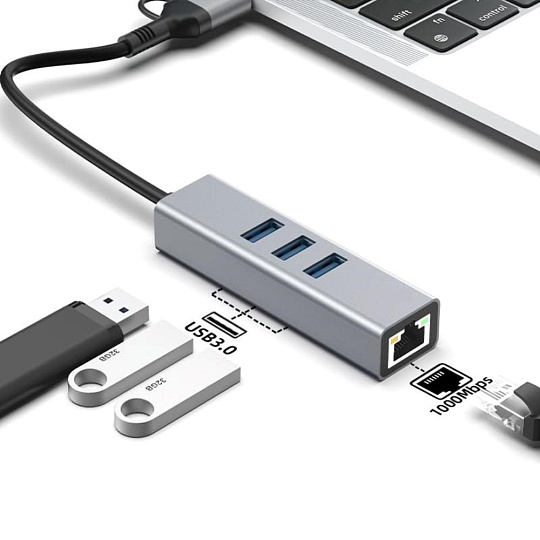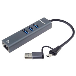 Převodník, který umožní připojit Váš počítač s portem USB typu C do internetu nebo k lokální síti pomocí kabelu s RJ45 a navíc umožňuje zapojit tři USB3.2 periferie jako USB disk, tiskárnu, klávesnici a myš