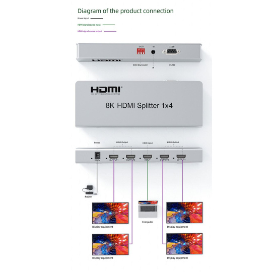 - Prepínač a správa EDID umožňuje pripojiť na výstup rôzne monitory, ktoré podporujú rozlíšenie 8K alebo 4K alebo FULL HD 1080p