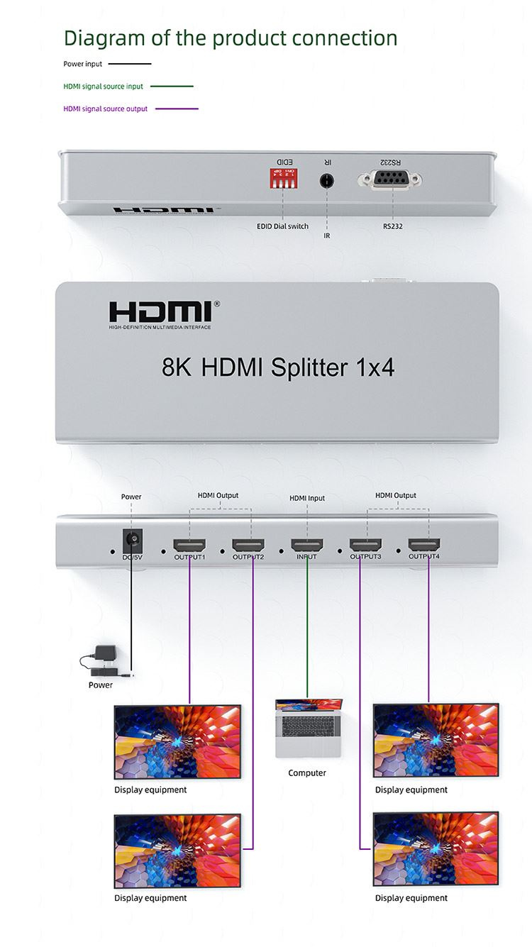 Môžete pripojiť až štyri HDMI obrazovky k jednému HDMI zdroju signálu ako je PC, notebook, DVD, set top box, atď.