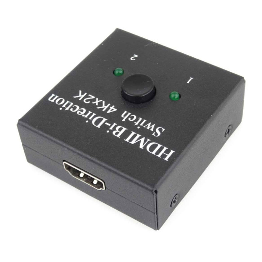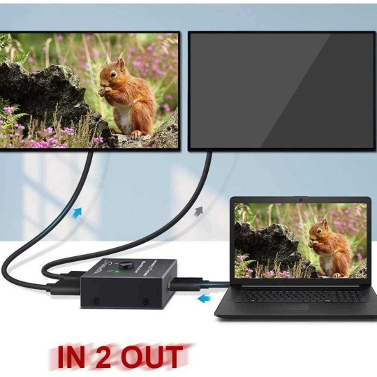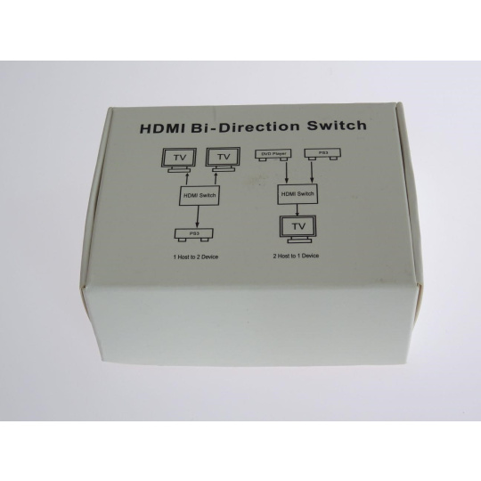 - Obousmerný 2x1 / 1x2 HDMI prepínač je možné použiť dvoma rôznymi spôsobmi: pripojiť 2 vstupné zdroje s 1 výstupným displejom alebo 1 vstupný zdroj so 2 displejmi (funguje iba na 1 obrazovke, nie súčasne).