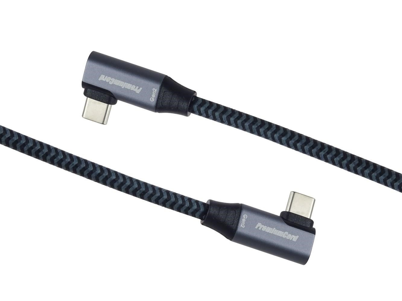 PremiumCord USB-C 2x zahnutý 90° kábel ( USB 3.2 GEN 2x2, 5A, 100W, 20Gbit/s ) hliníkové kryty konektorov, bavlnený opletenie, 2m