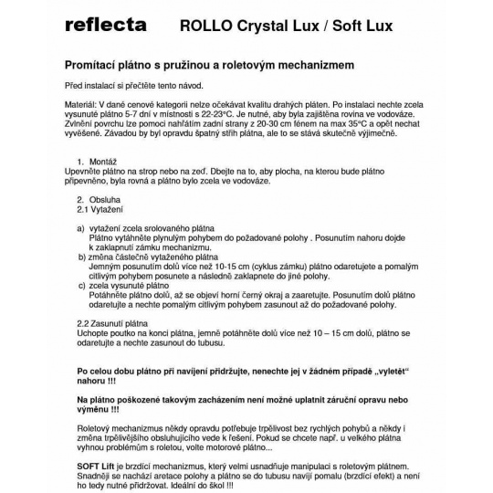 Roletové plátno ROLLO CrystalLine 200x200cm, viditeľná plocha 196x196cm, 1:1, 109"/277cm, biely hranatý kovový tubus 7x215cm/9kg, uchytenie na stenu alebo strop, materiál BetaLux - biela 0,35 tkanina 300g/m2 s 2cm čiernym okrajom a zadnou stranou, Gain=1,0, pozorovací uhol 120°. Lux - biely matný povrch pre maximálne vierohodný a kontrastný obraz pri aspoň čiastočnom zatmení. PVC materiál s textilným základom vytvára rovný povrch bez záhybov, ale v okrajoch môže dochádzať k prehnutiu - postupne mizne. Jednoduché uchytenie 4 vruty na plastových stranách plátna - stena alebo strop. Možnosť aretácie polohy plátna pri každom otáčení mechanizmu. Pozor pri spätnom navíjaní plátna je nutné plátno držať - nesmie dôjsť k rýchlemu navinutiui, ktoré pri náraze na tubus môže poškodiť vnútorný mechanizmus bez možnosti uplatnenia záručnej doby.