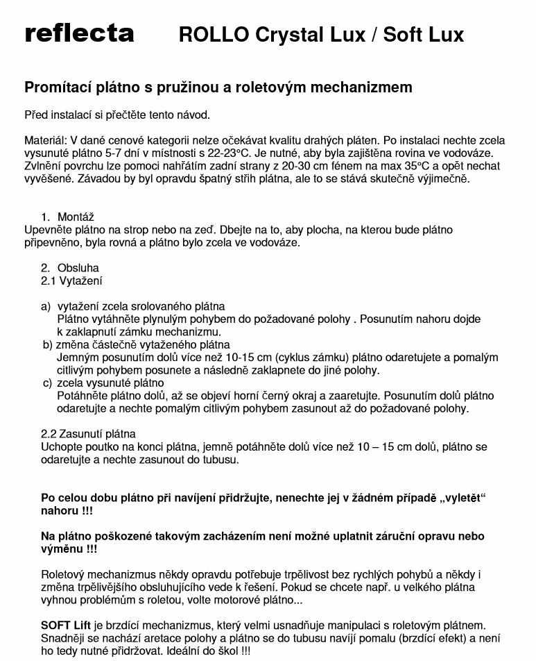 Roletové plátno ROLLO CrystalLine 200x200cm, viditeľná plocha 196x196cm, 1:1, 109"/277cm, biely hranatý kovový tubus 7x215cm/9kg, uchytenie na stenu alebo strop, materiál BetaLux - biela 0,35 tkanina 300g/m2 s 2cm čiernym okrajom a zadnou stranou, Gain=1,0, pozorovací uhol 120°. Lux - biely matný povrch pre maximálne vierohodný a kontrastný obraz pri aspoň čiastočnom zatmení. PVC materiál s textilným základom vytvára rovný povrch bez záhybov, ale v okrajoch môže dochádzať k prehnutiu - postupne mizne. Jednoduché uchytenie 4 vruty na plastových stranách plátna - stena alebo strop. Možnosť aretácie polohy plátna pri každom otáčení mechanizmu. Pozor pri spätnom navíjaní plátna je nutné plátno držať - nesmie dôjsť k rýchlemu navinutiui, ktoré pri náraze na tubus môže poškodiť vnútorný mechanizmus bez možnosti uplatnenia záručnej doby.