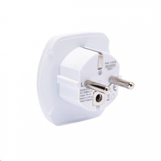 univerzálny adaptér s uzemnením, max. 16A pre cudzincov pri návšteve Českej republiky, Slovenska alebo pre pripojenie zahraničného výrobku s inou vidlicou napájacieho kábla do českých zásuviek všetky spotrebiče s 2- a 3-kolíkovým káblom patentovaný dizajn predĺžená zadná časť pre bezpečné vybratie adaptéra zo zásuvky detské bezpečnostné poistky farba: biela..