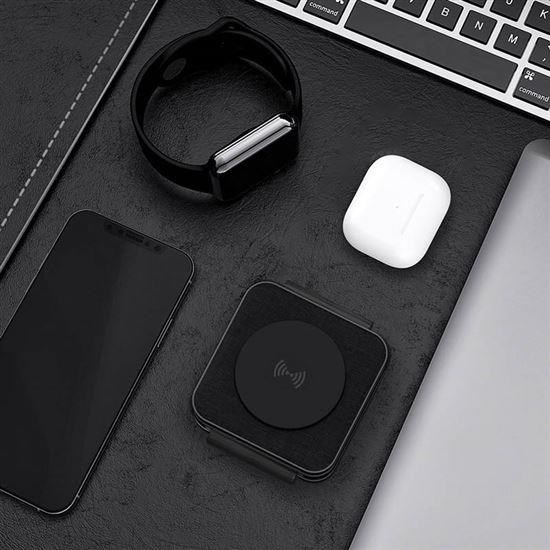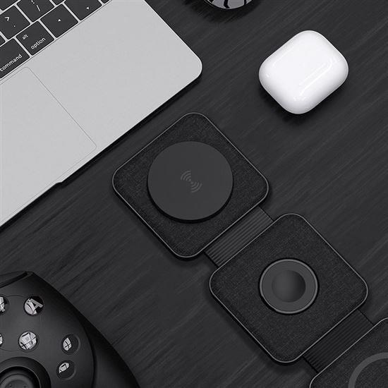 - hlavná nabíjacia plocha pre telefón (až 15 W), výklopná nabíjacia plocha pre Apple Watch (3 W) a sekundárna nabíjacia plocha pre slúchadlá/další telefón (5 W)