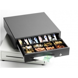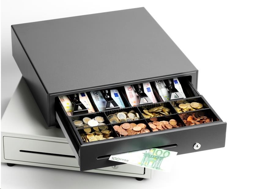 pokladničná zásuvka, otváranie spredu, rozmery (ŠxVxH): 410x114x415mm, vložka: 4 priehradky na bankovky (horizontálne), 8 priehradiek na mince, 1 priehradka na účtenky, 3poz. zámok, priame pripojenie tlačiarne, farba: tmavosivá..