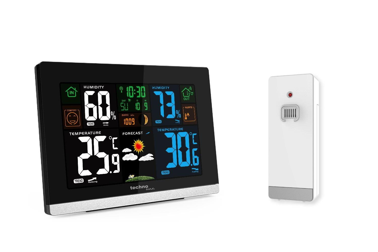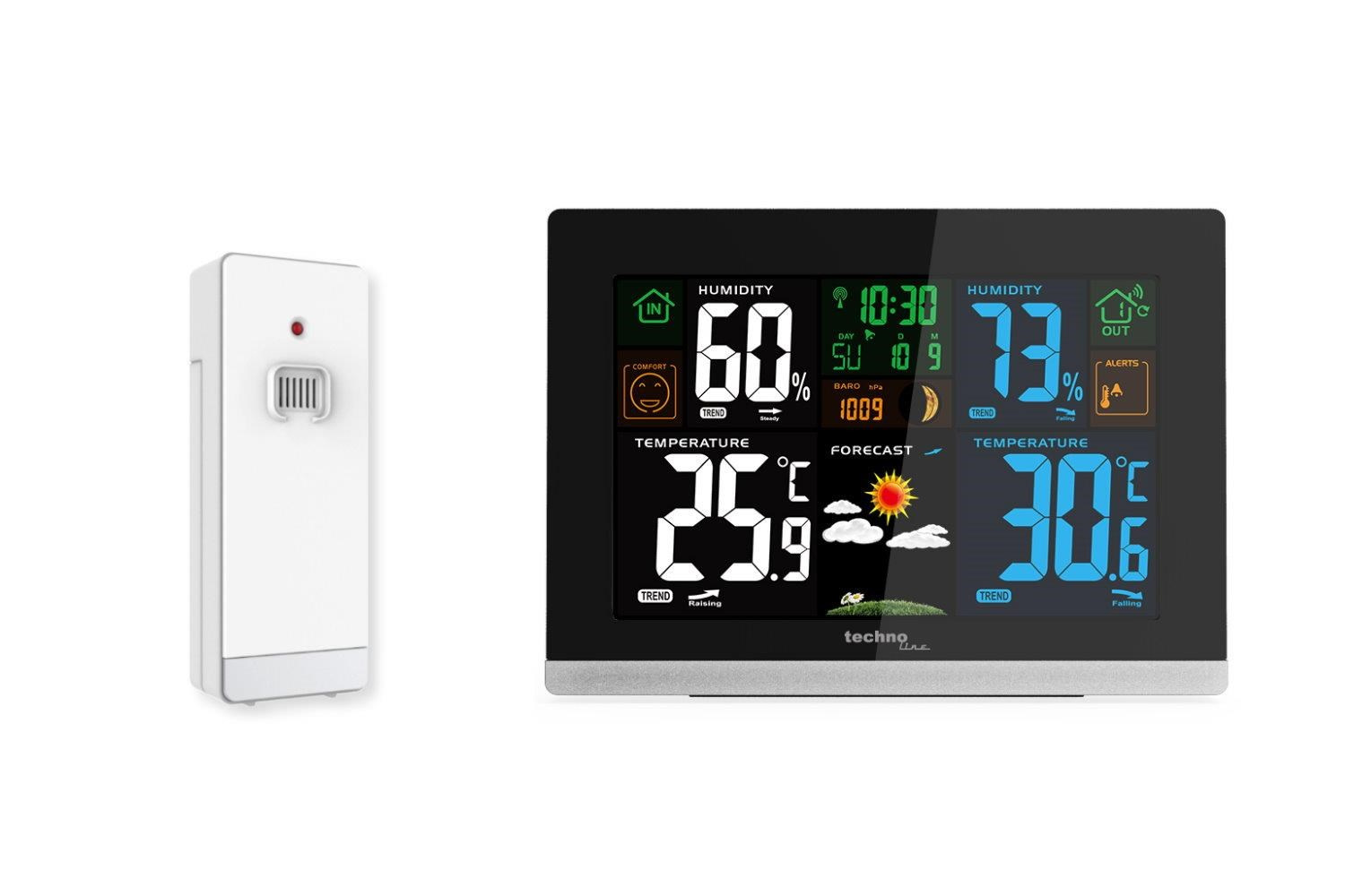 - barvy displeje: čas, datum zelená, barometrický tlak oranžová, vnitřní teplota a relativní vlhkost bílá, venkovní teplota a relativní vlhkost modrá