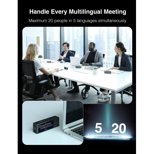 X1 funguje samostatne alebo v spojení so slúchadlami, čo prináša maximálnu flexibilitu pre rôzne situácie. Podporuje pripojenie až 20 zariadení, ktoré možno ľahko synchronizovať do jednej skupinovej konverzácie. Používatelia môžu komunikovať v reálnom čase a každý počuje preklad vo svojom jazyku. Ideálne riešenie pre firemné porady, workshopy alebo medzinárodné konferencie. Umožnite svojim tímom hovoriť slobodne bez jazykových bariér a posilnite spoluprácu na všetkých úrovniach.
