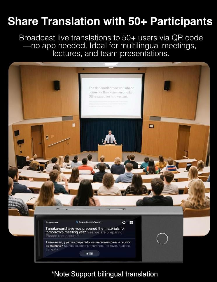 X1 AI Interpreter Hub umožňuje zdieľanie prekladu pomocou QR kódu pre viac ako 50 účastníkov bez nutnosti inštalácie akejkoľvek aplikácie. Toto riešenie je ideálne pre viacjazyčné stretnutia, prednášky a tímové prezentácie, kde je potrebné zabezpečiť rýchlu a efektívnu komunikáciu. Zrozumiteľnosť a plynulý priebeh rokovaní tak nie je ohrozený jazykovou bariérou. Vďaka tejto modernej technológii môžu všetci účastníci sledovať preklad v reálnom čase priamo na svojom zariadení.