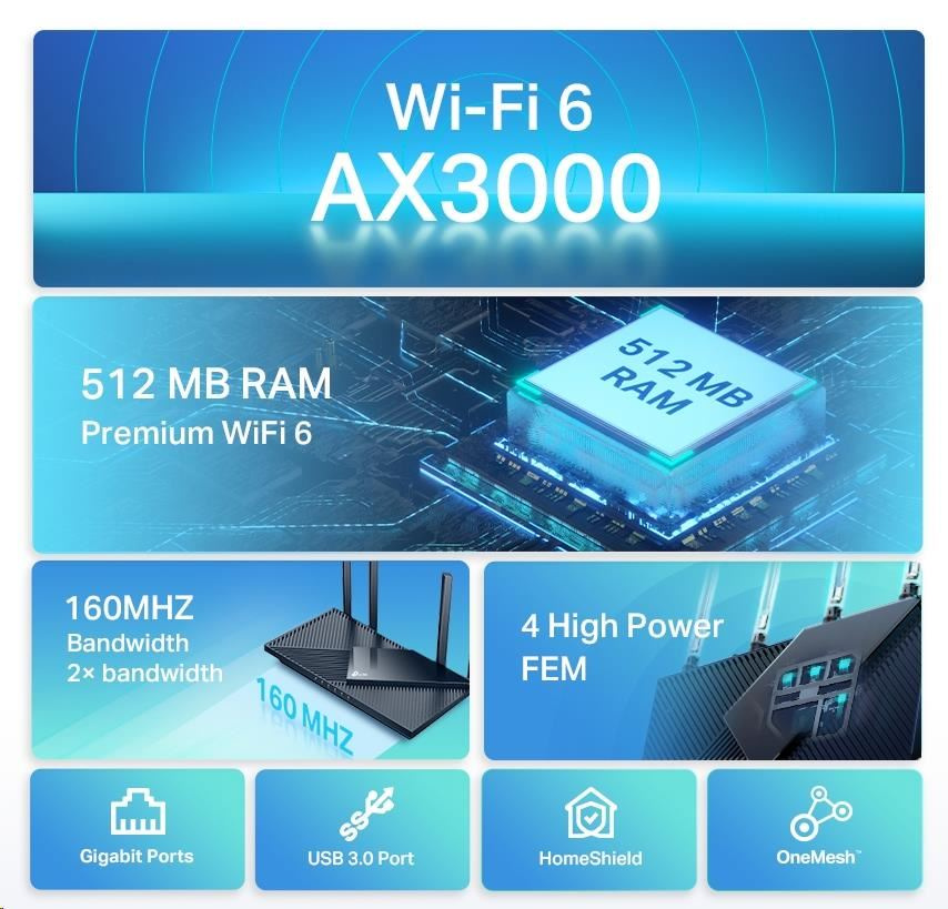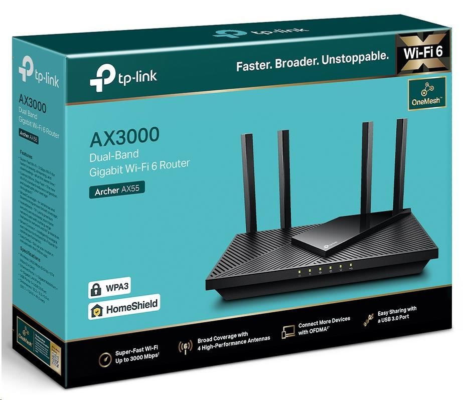 TP-Link Archer AX55 OneMesh/EasyMesh WiFi6 router (AX3000, 2,4GHz/5GHz, 4xGbELAN, 1xGbEWAN, 1xUSB3.0)