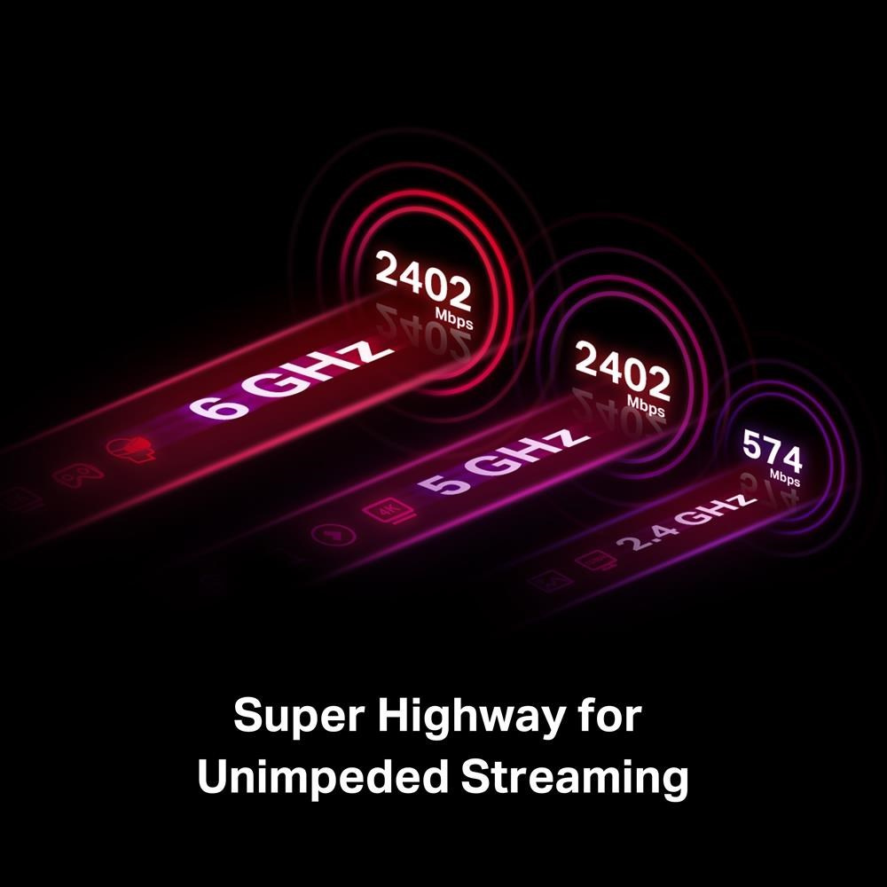- Bezkonkurenčná trojpásmová rýchlosť — zvýšte celkové rýchlosti až na 2 402 Mbit/s v pásme 6 GHz + 2 402 Mbit/s v pásme 5 GHz + 574 Mbit/s v pásme 2,4 GHz.