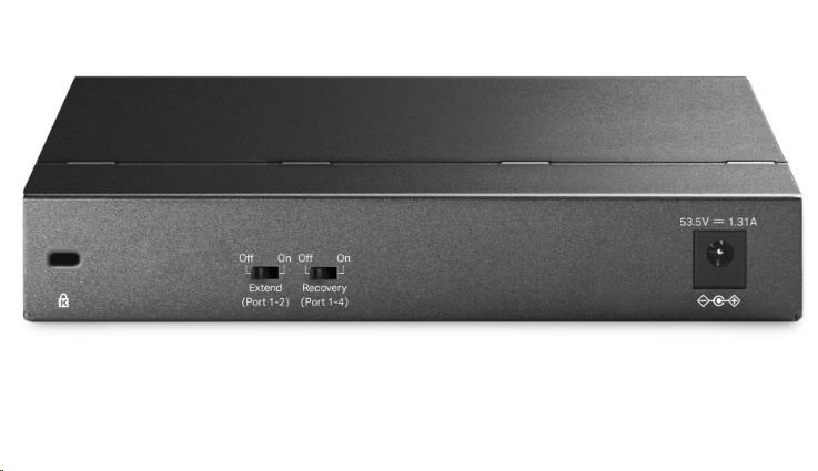 | Pokročilé funkcie | • Kompatibilné s IEEE 802.3af/at/bt PD • Automatické učenie a doba starosti MAC adresy • IEEE 802.3x flow control • 802.1p/DSCP QoS • IGMP snooping • Extend Mode Button (Porty 1–2, až 250 m napájanie PoE a prenos dát) • PoE Auto Recovery (Porty 1-4) |