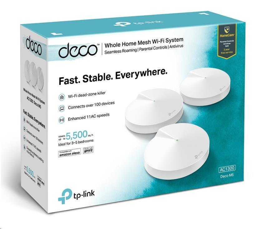 | Obsah balenia | Deco M5 (3-ka) 3 jednotky Deco M5 1 RJ45 ethernetový kábel 3 napájacie adaptéry Rýchly sprievodca inštaláciou Deco M5 (2-ka) 2 jednotky Deco M5 1 RJ45 ethernetový kábel 2 napájacie adaptéry Rýchly sprievodca inštaláciou Deco M5 (1-ka) 1 jednotka Deco M5 1 RJ45 ethernetový kábel 1 napájací adaptér Rýchly sprievodca inštaláciou |