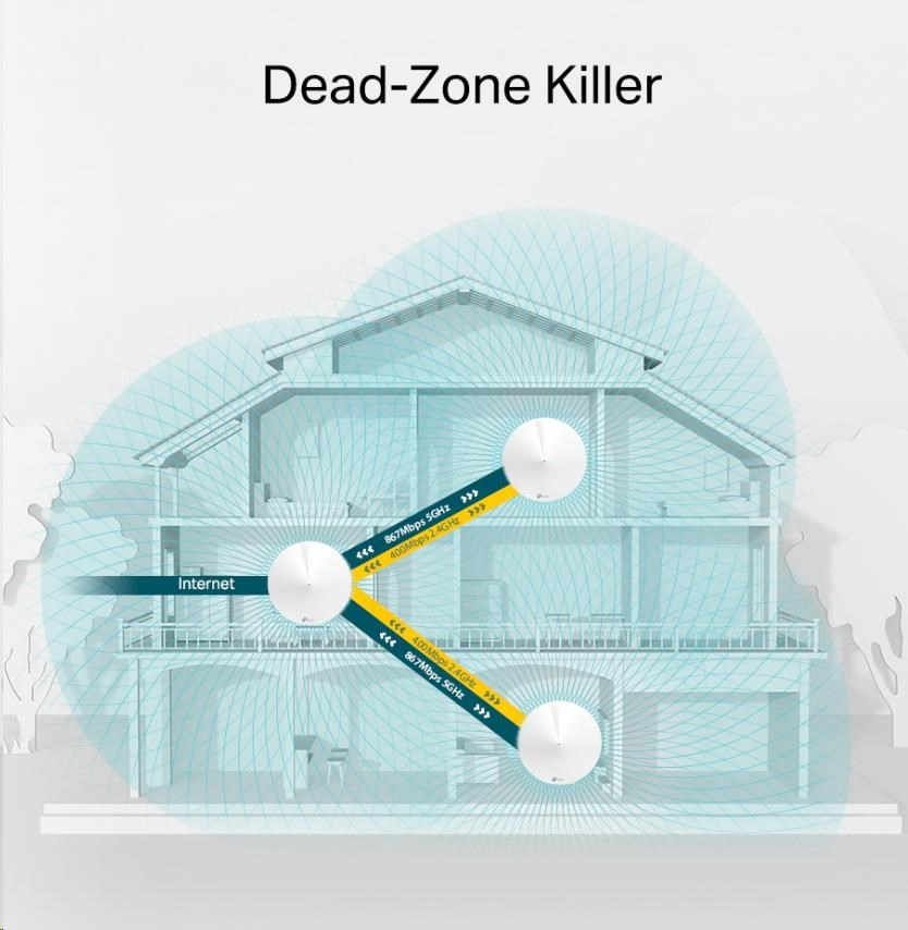 | Dohľad WiFi | Domy na 3-5 izbových (3-pack) TP-Link Mesh technológia Voliteľná Ethernetová spätná väzba spolupracuje na prepojení jednotiek Deco pre bezproblémové pokrytie 4× antény (vnútorné) Viacnásobné antény tvoria zosilňujúce pole, ktoré pokrýva viac smerov a veľké plochy Beamforming Zameriava bezdrôtový signál na klientov, aby rozšíril dosah WiFi |