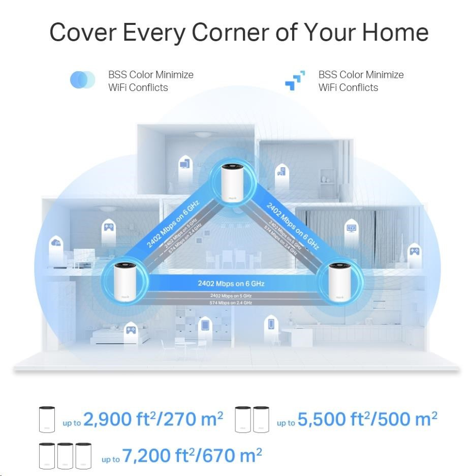 - Wi-Fi 6E pokrytie celej domácnosti – pokryte plochu až 670 m2 ničím nerušeným Wi-Fi signálom budúcej generácie a zabudnite na mŕtve zóny pokrytia a načítanie do vyrovnávacej pamäti