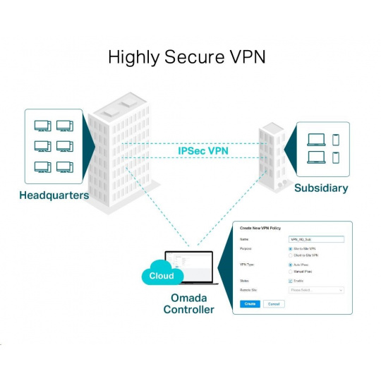 | IPsec VPN | • 20 IPsec VPN tunelov • LAN-to-LAN, Client-to-LAN • Hlavný, agresívny režim vyjednávania • Šifrovacie algoritmy DES, 3DES, AES128, AES192, AES256 • IKEv1/v2 • MD5, SHA1 autentifikačné algoritmy • NAT Traversal (NAT-T) • Dead Peer Detection (DPD) • Perfect Forward Secrecy (PFS) |