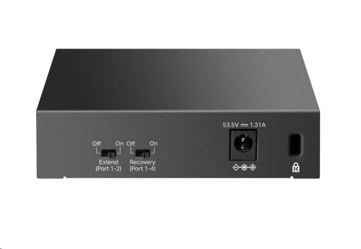 | Rozhranie | • 5× 10/100/1000Mbps RJ45 portov (Porty 1–4 podporujú 802.3af/at PoE+) • AUTO Negotiation • AUTO MDI/MDIX |