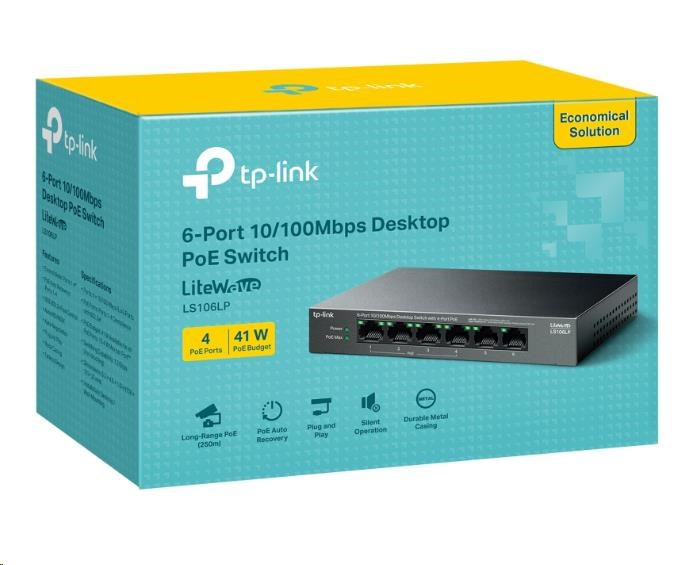 TP-Link LiteWave switch LS106LP (6x100Mb/s, 4xPoE, 41W, fanless)