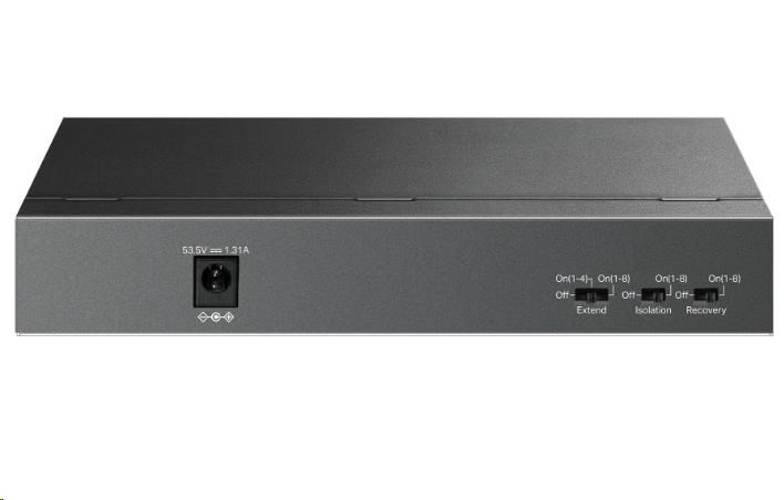| Pokročilé vlastnosti | • Tlačidlo Mode Extend (porty 1–4/1–8, až 250 m napájanie PoE a prenos dát) • Tlačidlo režimu izolácie (porty 1–8) • Tlačidlo Auto Recovery PoE (porty 1–8) • Kompatibilný s PD IEEE 802.3af/at • Automatické učenie MAC adries a ich automatické vymazanie • IEEE 802.3x riadenie prietoku • Zelená technológia |