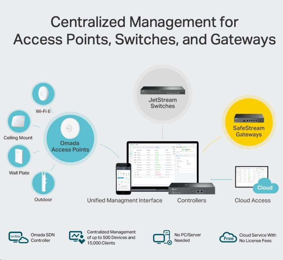 - Centralizovaná správa - až 500 prístupových bodov Omada, 100 JetStream switchov a 100 SafeStream smerovačov.