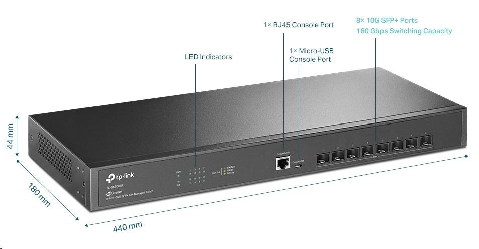Vytvorte si a podľa potreby rozširujte rýchlu sieť s jednotkou TP-Link SX3008F – plne riadeným switchom s 8 optickými portami 10G a priepustnosťou 160 Gbit/s. Je ideálny pre malé, stredné aj veľké firmy a spĺňa, alebo dokonca prevyšuje požiadavky na veľmi rýchle, spoľahlivé a bezpečné firemné siete.