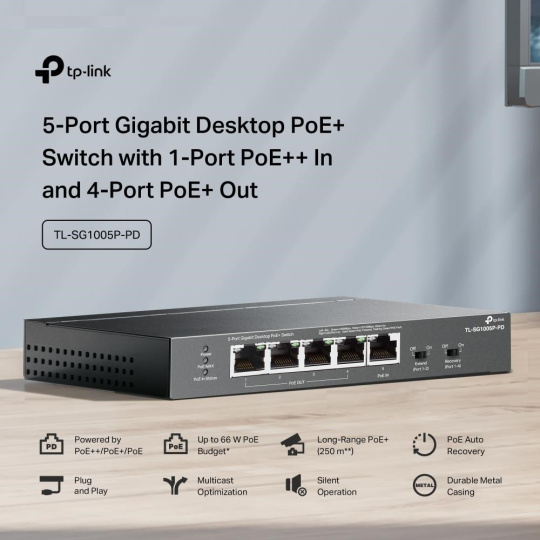 - 1 gigabitový port PoE++ In a 4 porty PoE+ Out: Podporuje rozpočet výstupného PoE napájania až 66 W / 47 W / 21 W / 9 W PoE pri vstupnom PoE napájaní podľa štandardu 802.3bt Type 4, 802.3bt Type 3, 802.3at a 802.3af v tomto poradí