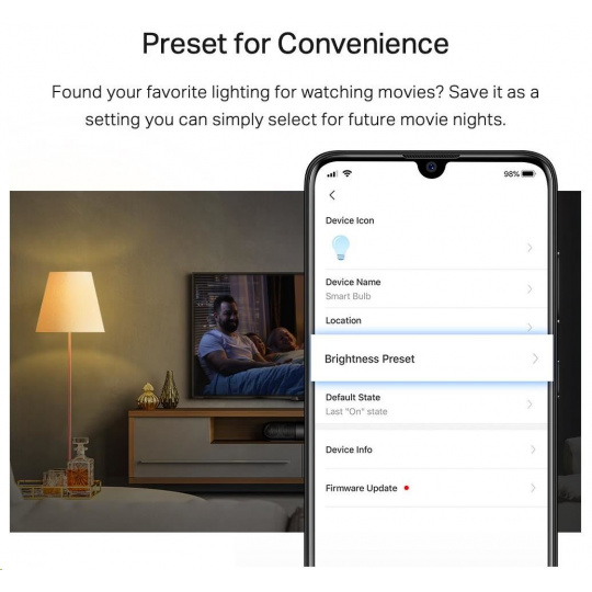 - Stmívatelná (nastavení pro vaše pohodlí) – Našli jste své oblíbené osvětlení pro sledování filmů? Uložte jej jako nastavení, které si můžete jednoduše vybrat pro budoucí filmové noci