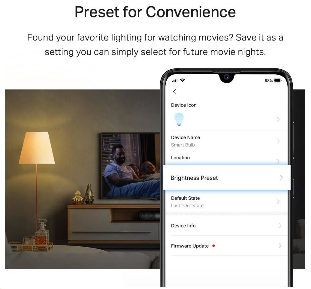 - Stmívatelná (nastavení pro vaše pohodlí) – Našli jste své oblíbené osvětlení pro sledování filmů? Uložte jej jako nastavení, které si můžete jednoduše vybrat pro budoucí filmové noci