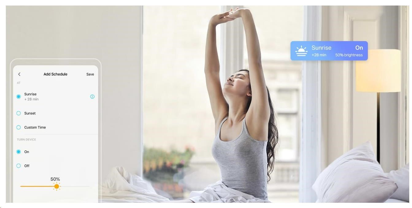 - Časový plán (nastavte si časy) – Vytvořte si pravidelný plán pro zapnutí/vypnutí s nastaveným jasem