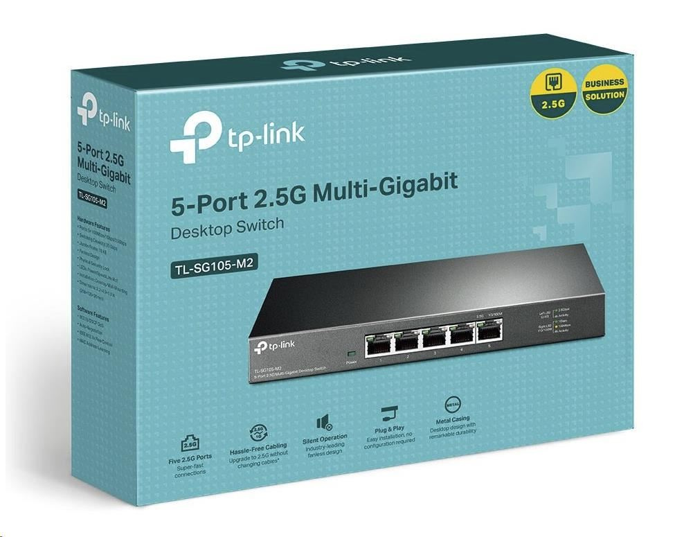 - Spoločnosť TP-Link prichádza s novou radou Multi Gigabitových switchov, ktoré dokážu nadviazať až 2,5 Gb/s link na každom porte. Tento základný model TL-SG105-M2 bez manažmentu v kovovom šasi má spolu 5 kovových portov s rýchlosťou 100M/1G/2.5G, indikačné LED na každom porte a jeden DC konektor na napájanie switche na zadnej strane (12V / 1.5A).