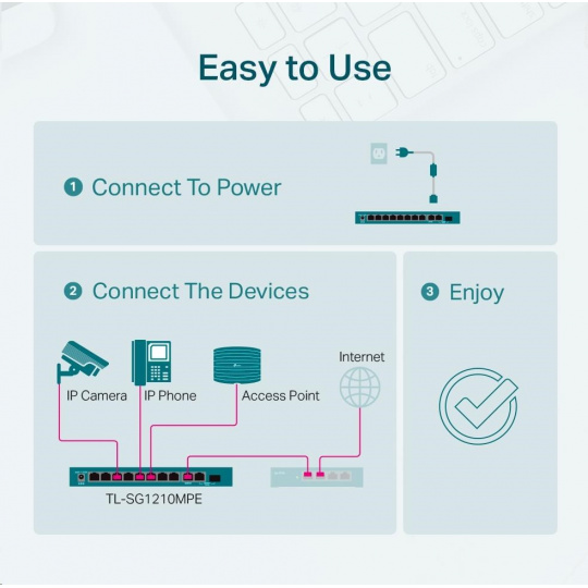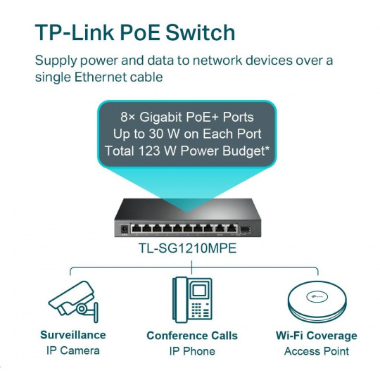 TL-SG1210MPE je plne kompatibilný so zariadeniami PoE, ako sú IP kamery, body prístupu a IP telefony. Môže byť tiež použitý na káblové pripojenie zariadení bez PoE, ako sú počítače, tlačiarne a IPTV.