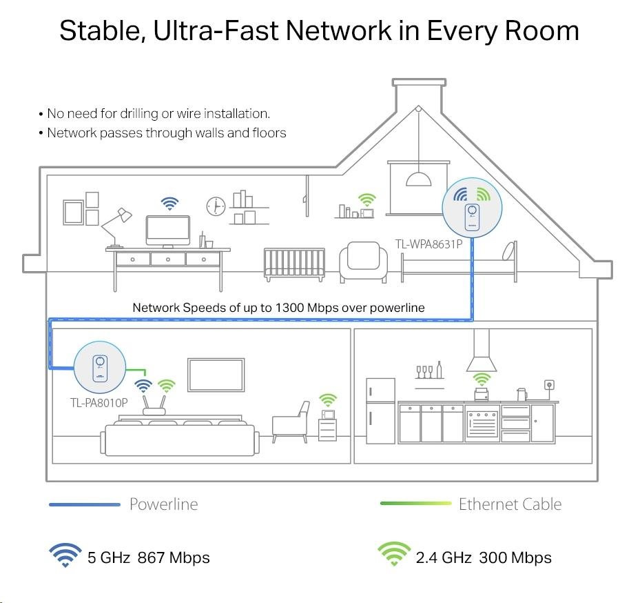 - Dvoupásmová sieť Wi-Fi AC1200 – zariadenie rozšíri ultra rýchlu dvoupásmovú Wi-Fi sieť s rýchlosťou až 867 Mbit/s v pásme 5 GHz a až 300 Mbit/s v pásme 2,4 GHz.