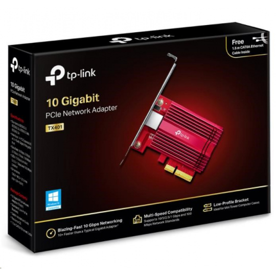 - Sieť s rýchlosťou 10 Gbit/s – sieťová karta TX401 dosahuje vďaka najnovšej technológii 10-GBase-T extrémnych rýchlostí až 10 Gbit/s, čo predstavuje desatinásobok rýchlosti typických gigabitových adaptérov. Zaručuje tým plynulé prenosy dát ako pri prístupe k internetu, tak aj počas presunov v rámci lokálnej siete.